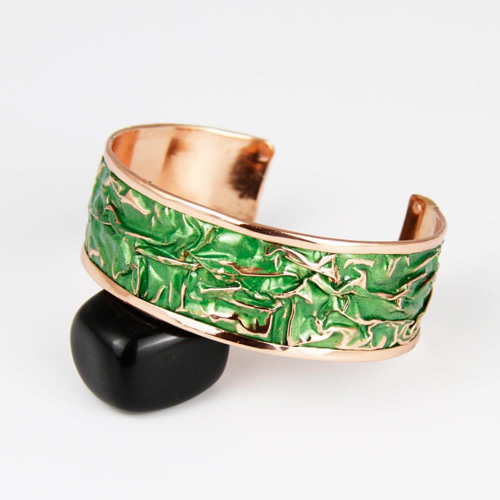 Bakırın doğallığı ve akrilik boyanın sanatsal dokunuşu ile tasarlanan bu bileklikler, aynı zamanda bakırın geleneksel olarak bilinen enerjik ve koruyucu özelliklerini de taşır.
